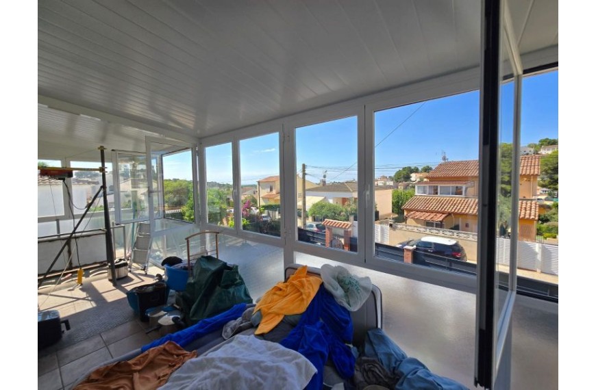 Planta primera : salón comedor con cocina americana, abierta a través de ventana, terraza acristalada con cerramientos de aluminio blanco y cristal climalit, 3 habitaciones, baño